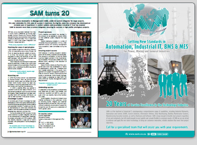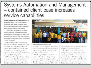 Systems Automation and Management (SAM) was founded in June 1988 and has grown to a complement of 60 people, comprising mostly technical and engineering staff with six administrative personnel and nine panel builders....