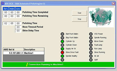 The SAM ALM software is a Visual Basic based program that can be installed onto a standard Windows XP based (other systems not tested) operating system. SAM ALM is not required for polishing operation but is required to change system timers and is a handy tool for fault finding. The SAM ALM software requires the Beckhoff TwinCat CP system manager to be installed for successful communication.